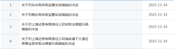 上海证券被采取出具警示函的行政监管措施,并记入证券期货市场诚信档案;上海证券瑞安塘下大道证券营业部被出具警示函,颜伶俐、朱伶俐等4名员工被采取监管谈话措施。